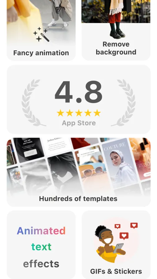 Hundreds of templates. Background cutouts. Fancy animation. Text effects. GIFs and stickers.