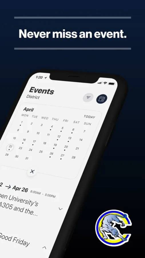 The event section shows a list of events throughout the district. Users can add an event to their calendar to share the event with friends and family with one tap.