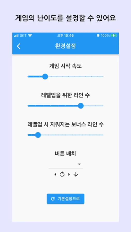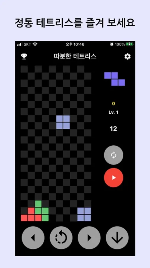 정통 테트리스를 즐겨 보세요. 게임 속도 등을 수정하여 난이도를 설정할 수 있습니다.