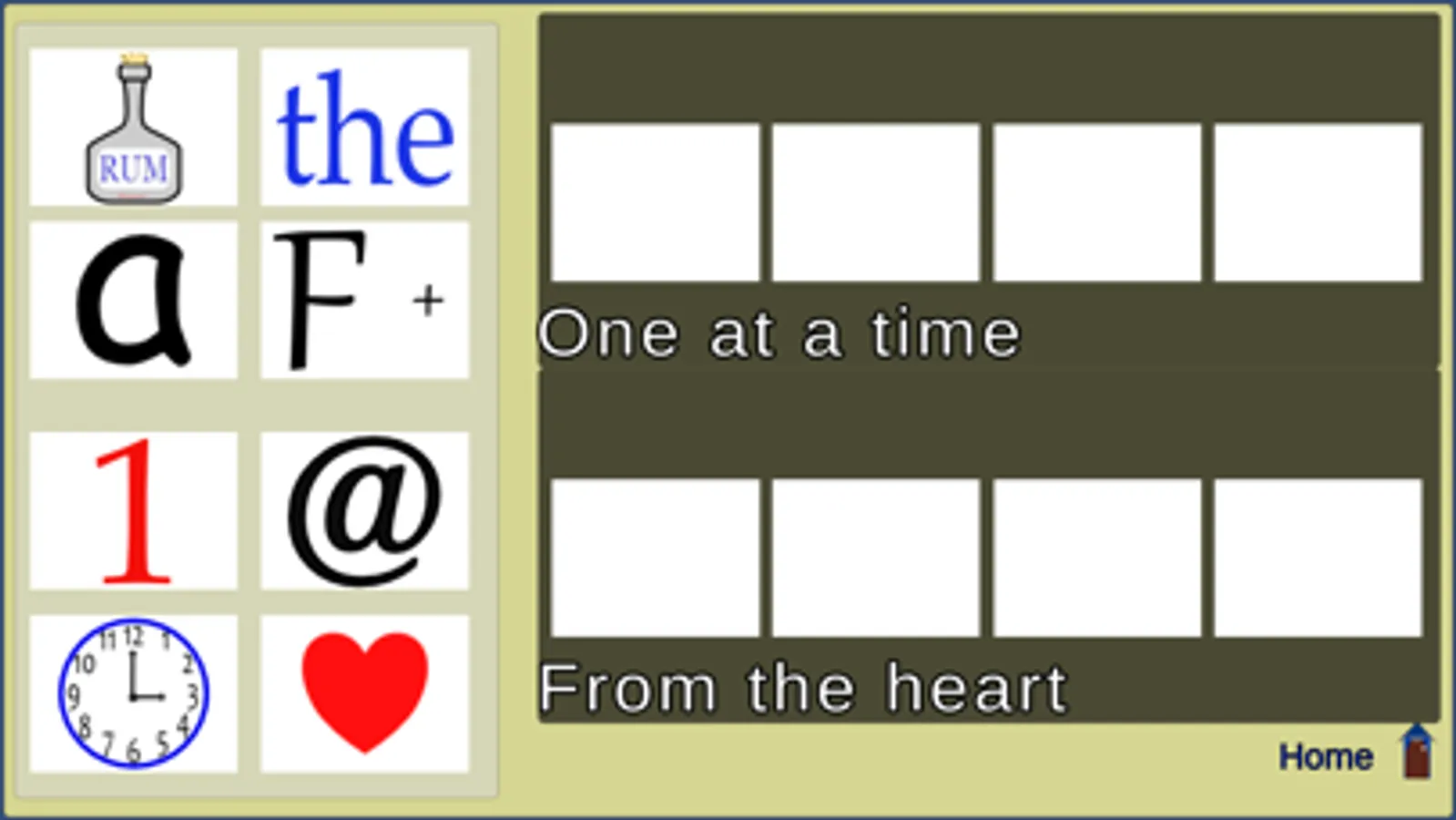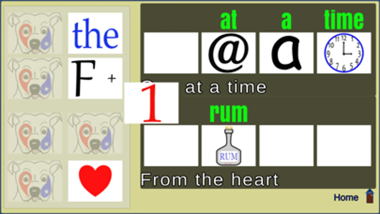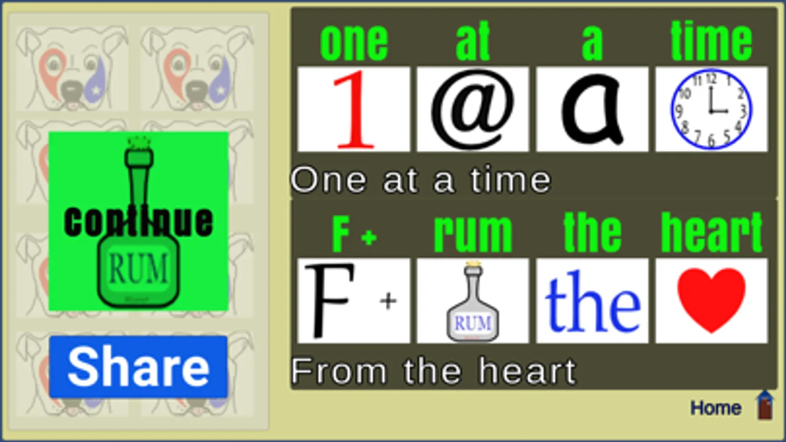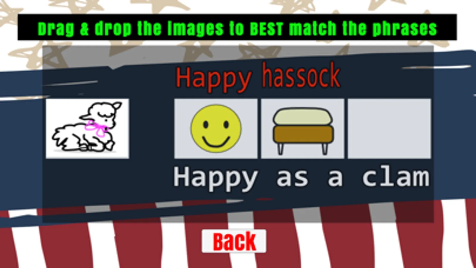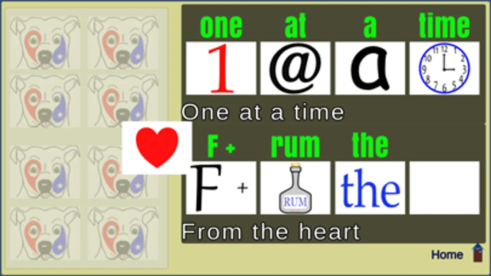 A casual rebus puzzle. No time limit or score. Simply drag the images to the empty boxes above the phrases. Green text appears above an image when it is in the correct spot, and the phrase is roughly spelled out phonetically by the images. Simple, fun and relaxing.