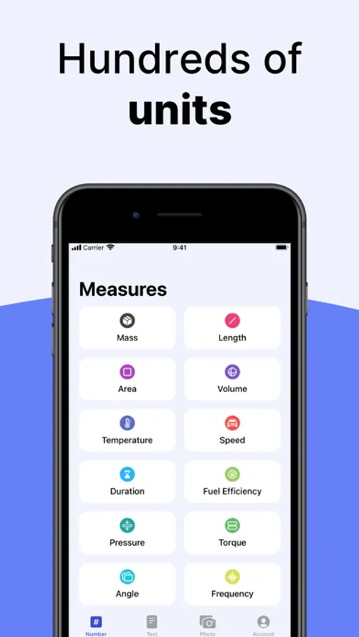 Convert hundreds of supported unit types for: length, area, capacity (volume), mass, temperature, speed, fuel efficiency, torque, pressure, angle, duration, frequency, energy, power, concentration of mass, electric charge, electric current, electric potential, electric resistance and information storage.