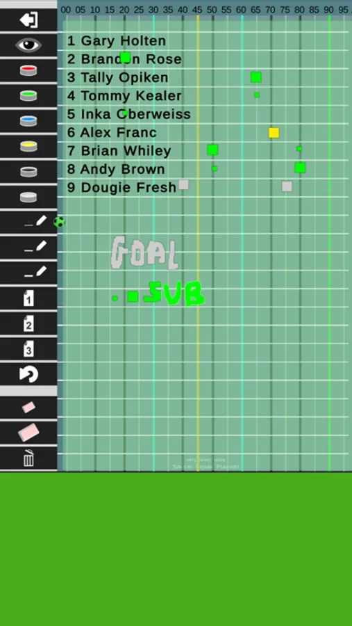 Simple matchplay timing chart with drawing tools to quickly add information about a match, like subbed on/off, goals, assists, etc.