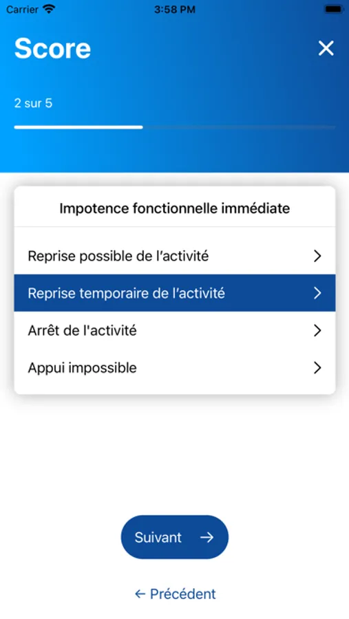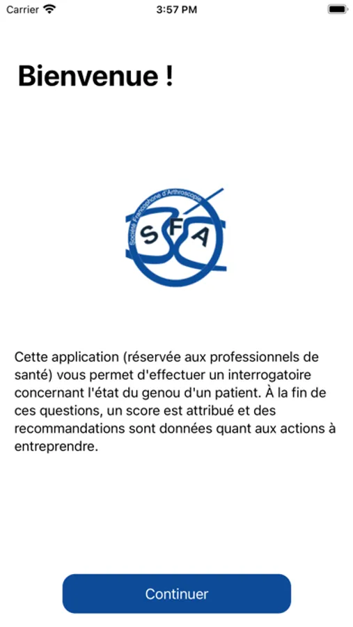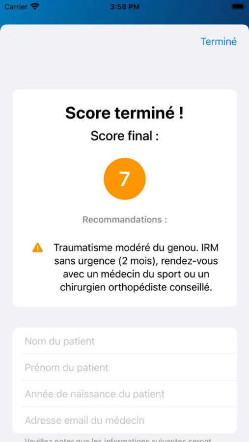 Determine the best action for your patients with knee trauma. Thanks to a few simple questions, the application will determine a score indicating the severity of the trauma. This score is in no way a medical diagnosis and must simply guide the professional in his decision-making.