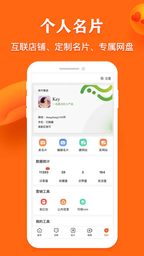 * 社交:创建自己的名片网社交账号,让自己多一个社交平台(可自主创建电子名片+网站+域名、聊天、直播、发视频、发朋友圈等);