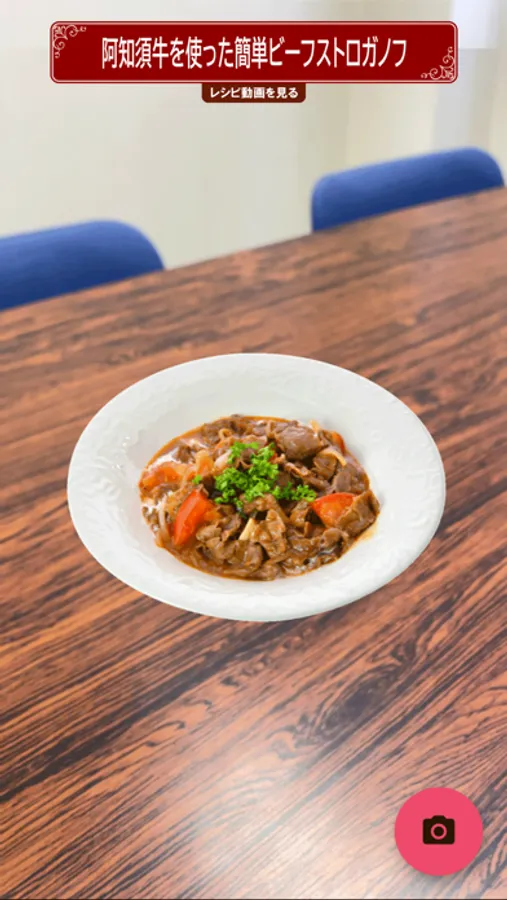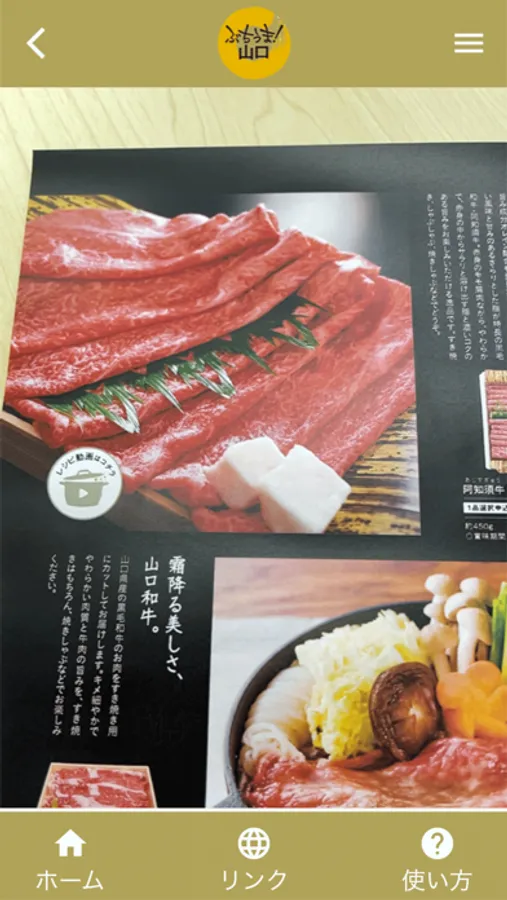 スマホをギフトカタログ(冊子)にかざすと、AR(拡張現実)機能を使って、山口県産品を使った料理写真やレシピ動画で楽しんでいただけます。