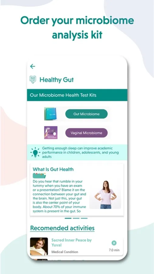 Our scientifically backed app created by experts will help you understand how your gut microbiome affects your metabolism. This, in turn, helps you make better decisions about your eating habits and the physical activities you perform. The recommendations would not only improve your gut health but would also augment your mental health. To top it off, various breathing, Yoga, and meditation activities will help you keep fit both mentally and physically.