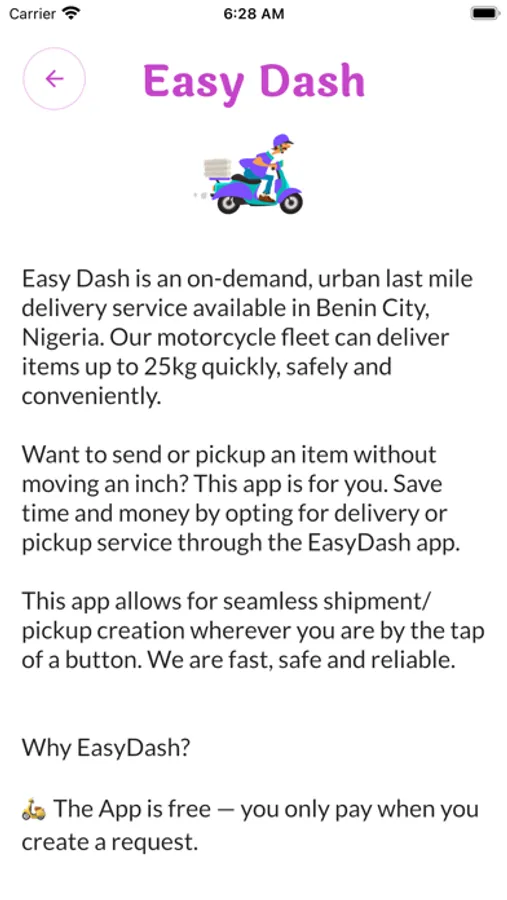 EasyDash is an on-demand, urban last mile delivery service available in Benin City, Nigeria. Our motorcycle fleet can deliver items up to 25kg quickly, safely and conveniently.