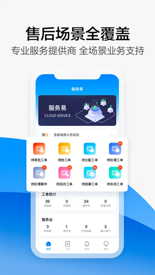 服务易是一款端到端的售后服务过程监管APP。主要模块包括:事件管理、工单管理、流程配置管理、备件管理、客户管理等。针对不同行业的售后服务厂商,可自定义配置管理信息,使得服务过程更加透明、清晰,同时提高工程师的整体服务效率,提升客户满意度。