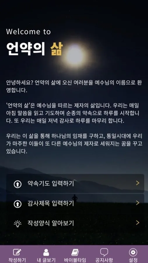 안녕하세요. 저희는 2013년 30명의 대학청년들의 북한중보기도모임으로부터 시작된 북한선교단체 SEE-IT 입니다. 본 앱의 이름은 언약의 삶이며, 대학청년통일선교운동의 일환으로, 선교적 삶을 자원하는 전국 대학캠퍼스 청년들로 하여금 말씀과 성령의 통치를 따르는 삶을 훈련할 목적으로 제작되었습니다.