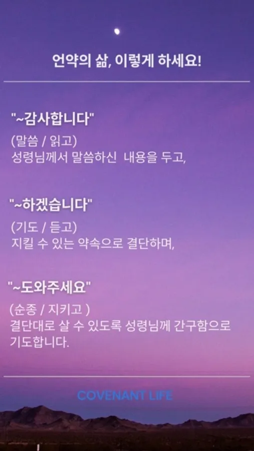 언약의 삶은 매일 아침 말씀을 읽고 성령님께서 주시는 감동에 대한 작은 약속으로 하루를 시작합니다. 또 매일 저녁 한줄 감사로 하루를 마무리 합니다.