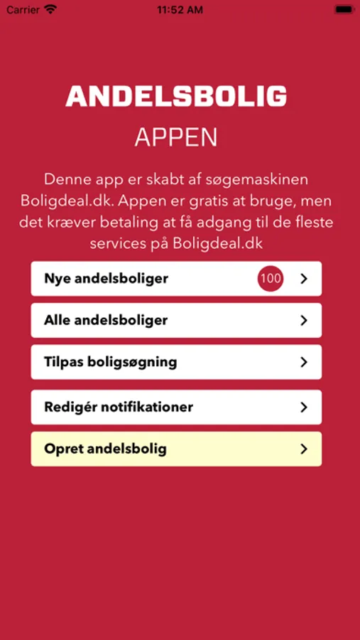 Med appen får du en opdateret liste med ledige andelsboliger i det geografiske område, hvor du søger. Du kan indstille appen, så du modtager notifikationer om nye andelsboliger, der passer til dine søgekriterier. App´en er skabt af Boligdeal.dk, som er en søgemaskine, der finder links til ledige boliger overalt på nettet. Som boligsøger linkes du videre til boliger på andre websites, hvor der oftest, men ikke nødvendigvis er direkte kontaktinfo til boligudbyderen. Søgemaskinen forsøger at give det fuldkomne overblik over ledige boliger og indeholder derfor boliger fra potentielt alle websites med ledige boliger. Alle boliger i appen linker videre til Boligdeal.dk. Appen giver mulighed for at modtage notifikationer om nye boliger. Du kan altid redigere dine notifikationer på siden "Redigér notifikationer" i appen. Appen er gratis at bruge, men mange services på Boligdeal.dk kræver betaling.