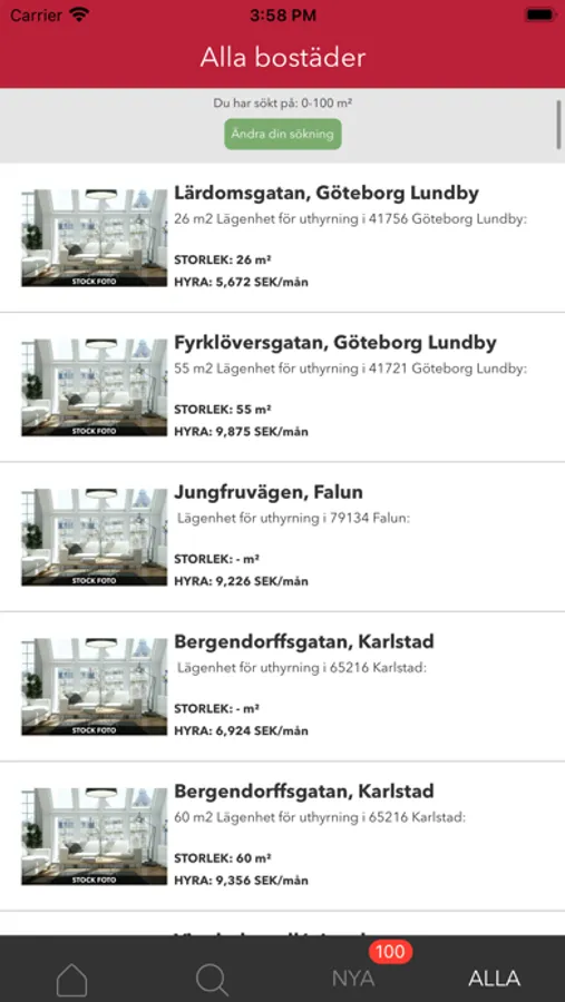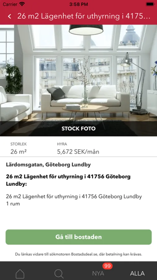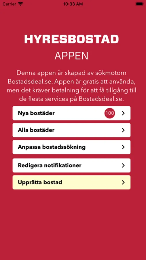 Med appen får du en uppdaterad lista med lediga hyresbostäder i det geografiska område som du söker i. Du kan ställa in appen så att du får notifikationer om nya hyresbostäder som passar dina sökkriterier. Appen är gjord av Bostadsdeal.se, som är en sökmotor som hittar länkar till lediga bostäder överallt på internet. Som bostadssökande länkas du vidare till bostaden på andra hemsidor där det oftast, men inte nödvändigtvis, är kontaktuppgifter direkt till bostadsägaren. Sökmotorn försöker ge en fullständig överblick över lediga bostäder och innehåller därför bostäder från potentiellt alla hemsidor med lediga bostäder. Alla bostäder i appen länkar vidare till Bostadsdeal.se. Appen ger dig möjlighet att få notifikationer om nya bostäder. Du kan alltid ändra dina notifikationer på sidan ”Redigera notifikationer" i appen. Appen är gratis att använda, men många tjänster på Bostadsdeal.se kräver betalning.