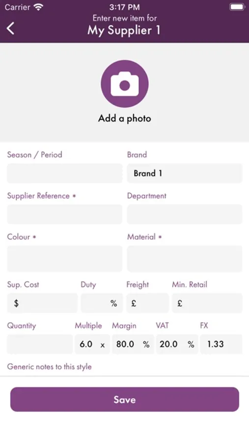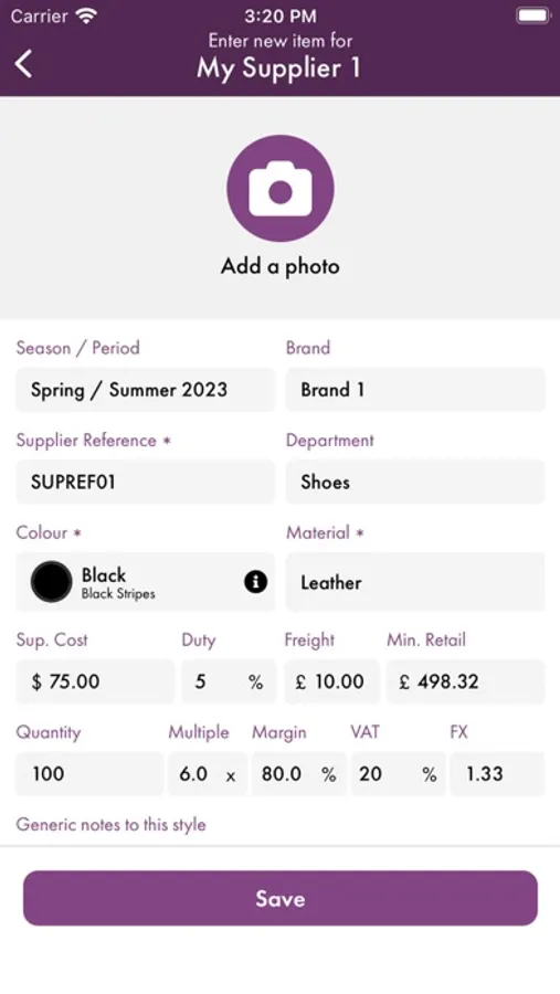 Add a new item with all relevant data such as Supplier, Brand, Reference Number, Colour, Material, Cost Price, Retail Price and Quantity Take photos of the products