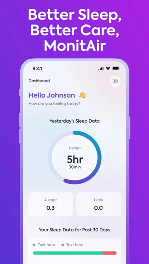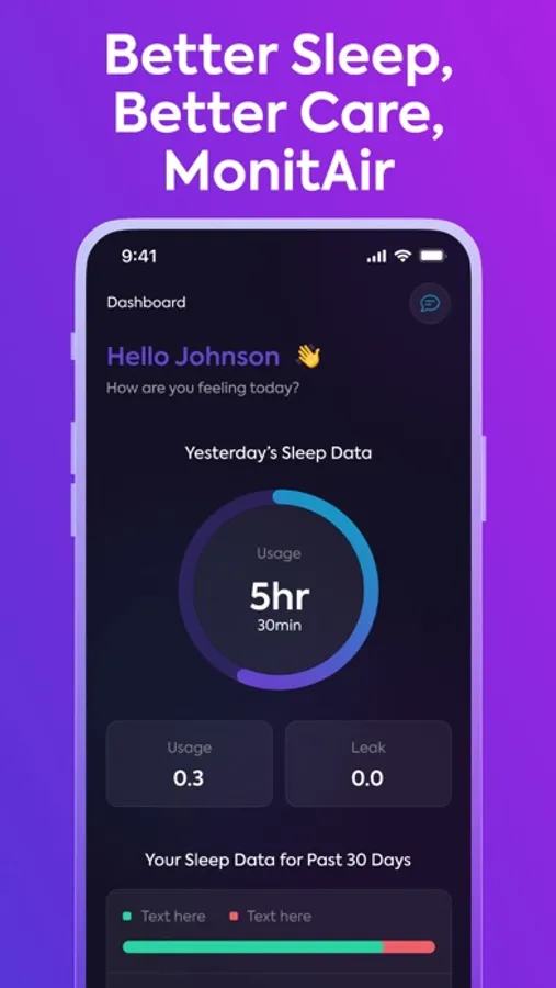 A patient-facing, HIPAA-compliant, app that allows patients to track their sleep data from their PAP (positive airway pressure) or NIV (non-invasive ventilator) device. The app integrates seamlessly with major cloud-based sleep devices to ensure patients have access to the same sleep data that their healthcare provider does, including important clinical metrics like AHI (apnea hypopnea index), device usage, and mask leak. By way of the app, users will not only be able to monitor their daily sleep data and their trends over time, but also communicate directly with their healthcare provider and staff to identify important sleep targets to ensure they are getting the most out of their PAP/NIV therapy. The app is a compliment to the MonitAir platform utilized by healthcare providers to ensure patients are being appropriately treated for their chronic sleep/respiratory conditions.