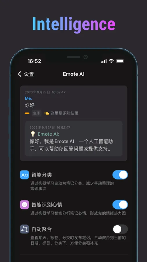 Has AI capabilities to automatically analyze note emotions and extract keywords;