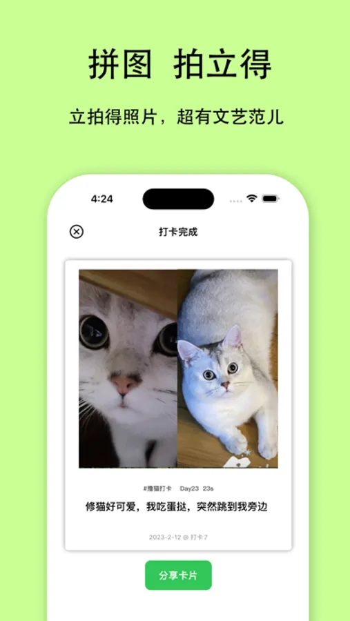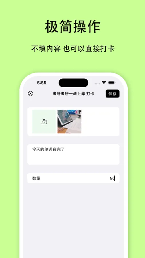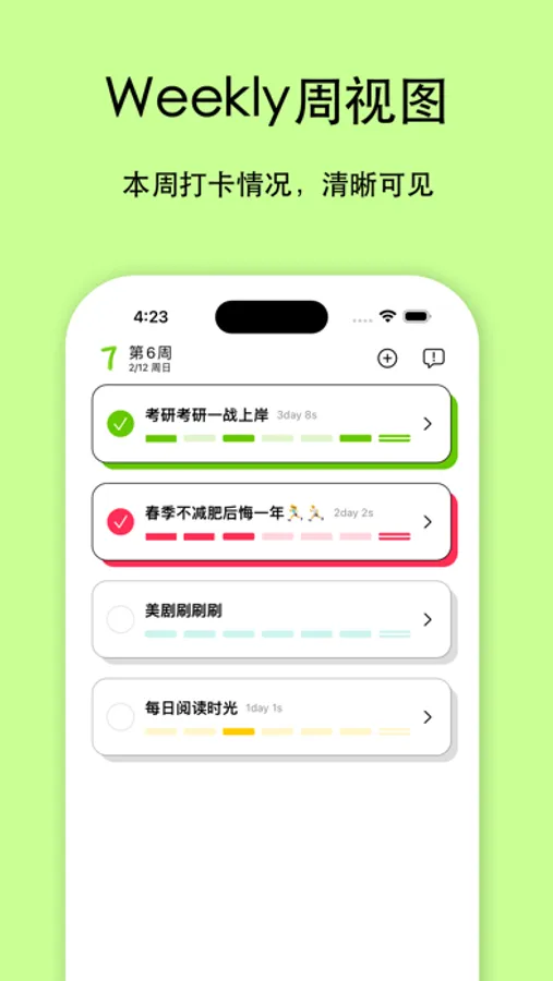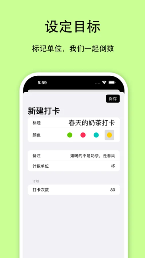 新建打卡:你可以在这里新建一个卡片,用以记录你想养成的一个习惯,或者你要坚持的事情。