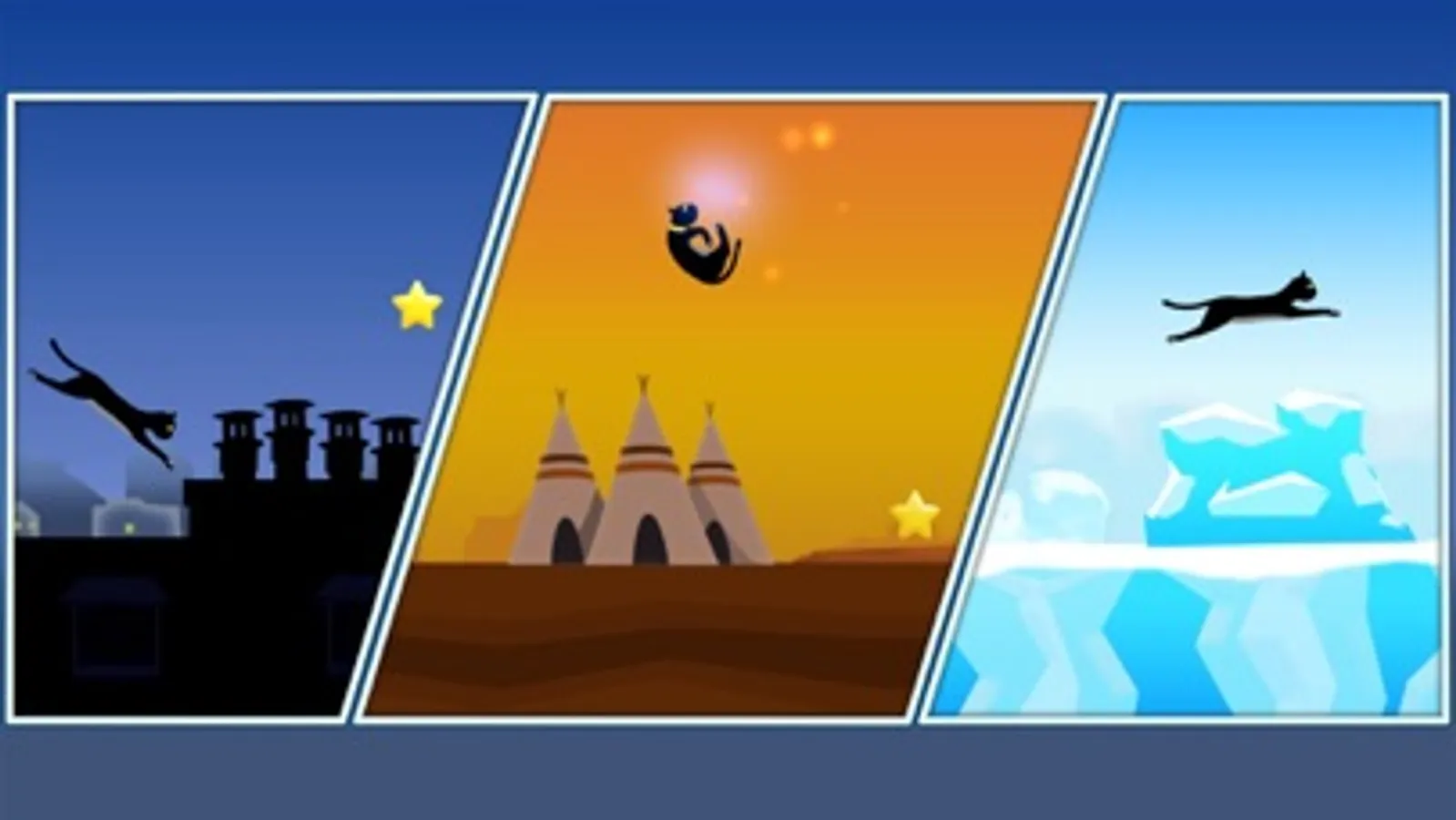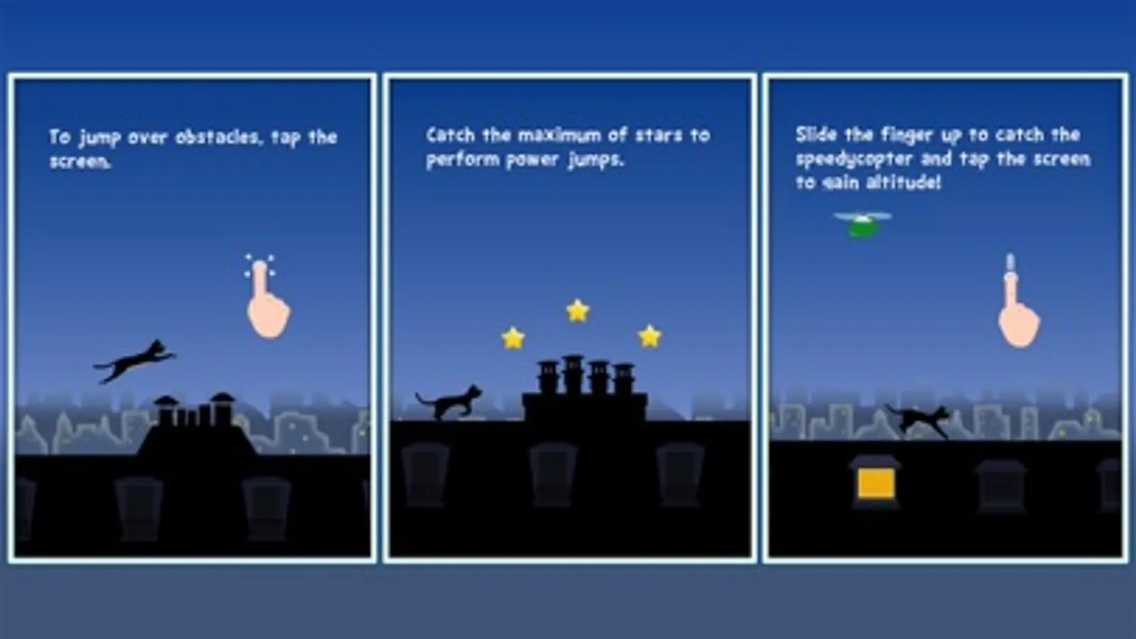 The avoiding game puts the black cat in three different settings. It all starts as a rooftop running game, nearly a parkour challenge, as the tutorial introduces you to the game basics. Your task is to help Mr Speedy survive its crazy race through the night. Tap the screen to jump over the chimneys and passages, tap twice in order to flip and hop over bigger troubles during your endless run. However, please mind that you have to collect stars to fill the power jump meter which allows Mister Speedy to perform backflips.