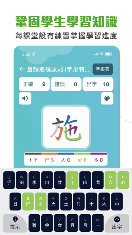 沿用五色拆碼技術,將練習字所包含的倉頡字根劃分成不同顏色,而練習字是為中小學生精心挑選的常用中文字