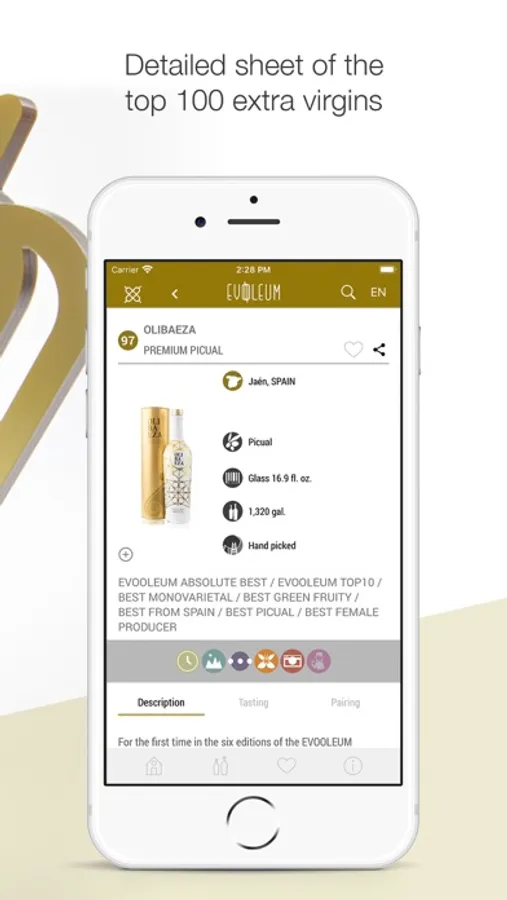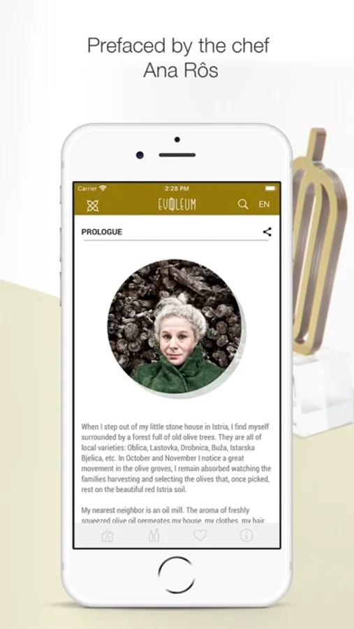 EVOOLEUM showcases the 100 best EVOOs in the world according to the results obtained in the prestigious EVOOLEUM Awards. A deluxe edition prologued by the renowned 2 Michelin-star chef Ana Roš (Hiša Franko) where the user can find Mediterranean recipes by chef Diego Guerrero (DSTAgE), the most surprising oleotourism routes in the world, what celebrities think of extra virgin olive oil, the historical curiosities of the olive tree, pairings... and more much more. A unique app that has become the most influential worldwide.