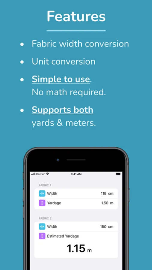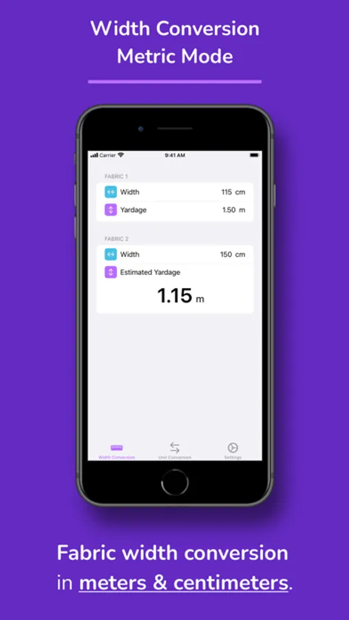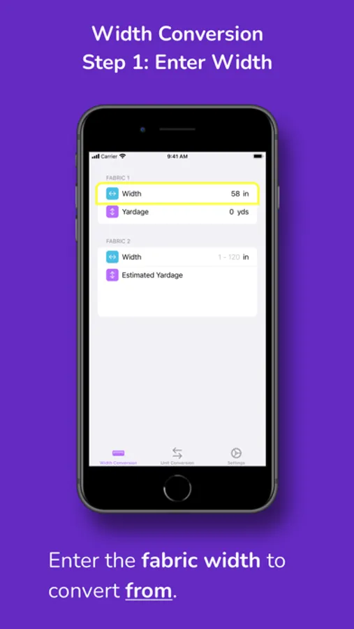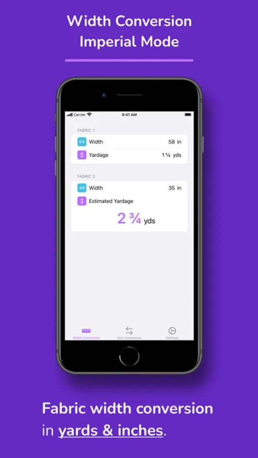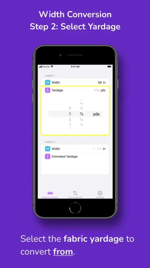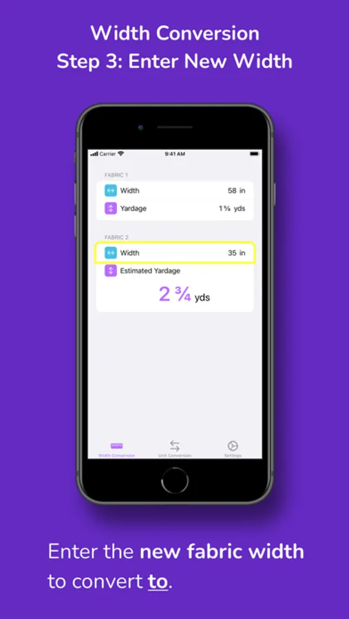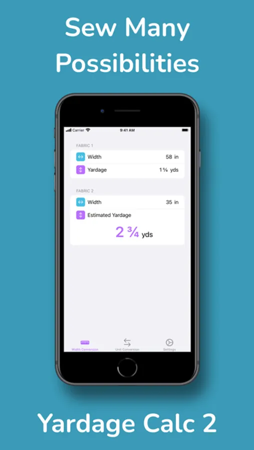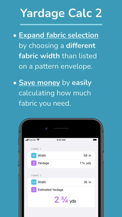 With Yardage Calc 2, you won't be limited to purchasing fabric in the standard 45" and 60" widths listed on pattern envelopes. Simply enter the fabric width, yardage, and new width and Yardage Calc will display the estimated new yardage. No math required.