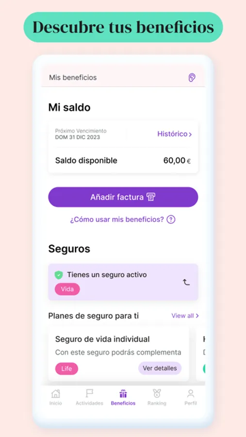 En esta app puedes escoger cualquier beneficio de bienestar que desees, por lo que siempre recibirás lo que realmente necesitas. Además, te proponemos retos físicos para fomentar el trabajo en equipo y hábitos saludables. Es ideal para equipos diversos y trabajadores remotos, ya que cada empleado tiene una experiencia de bienestar personalizada.