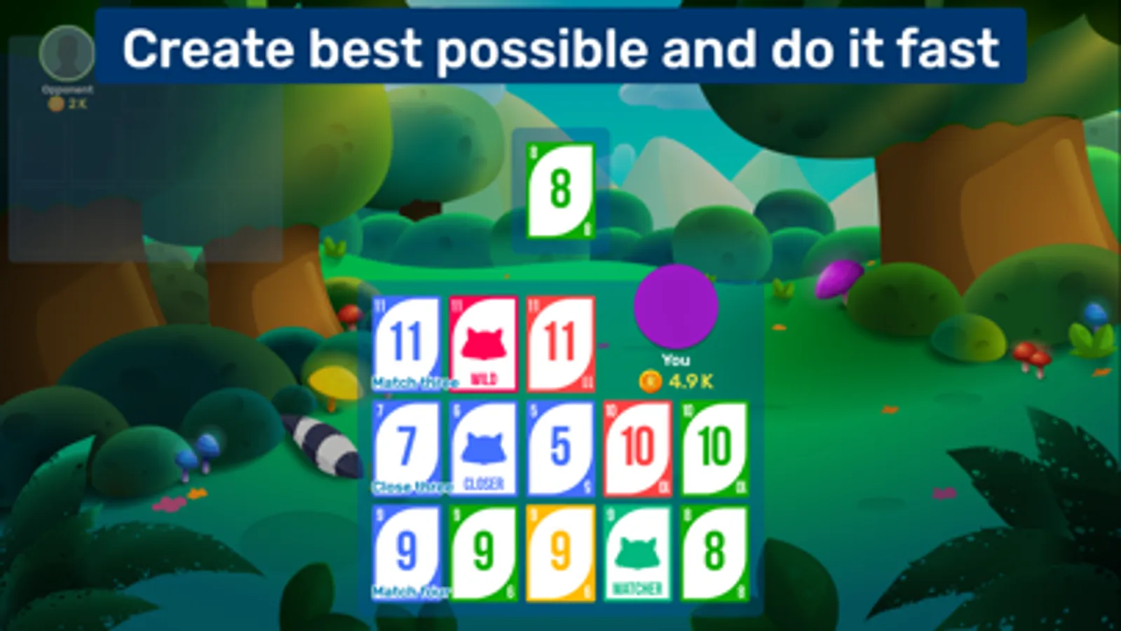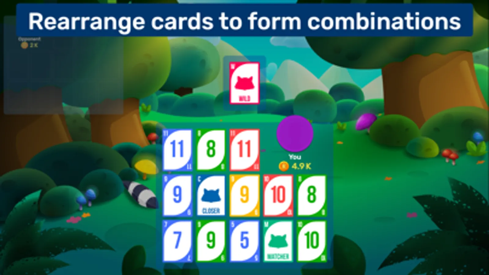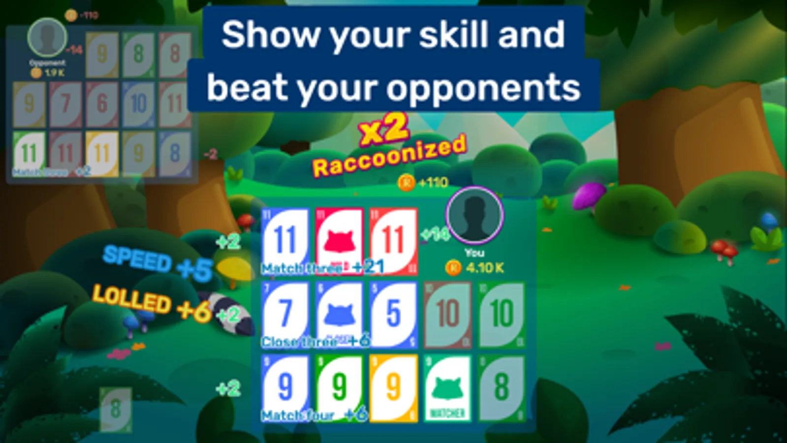 Match cards of the same rank or sequence of the same suit, with the goal being to form the best possible three-line combination. Speed bonuses and additionally seven wild cards are available to help you — also known as Raccoons. There are a lot of possible variations, ensuring fun is always guaranteed!