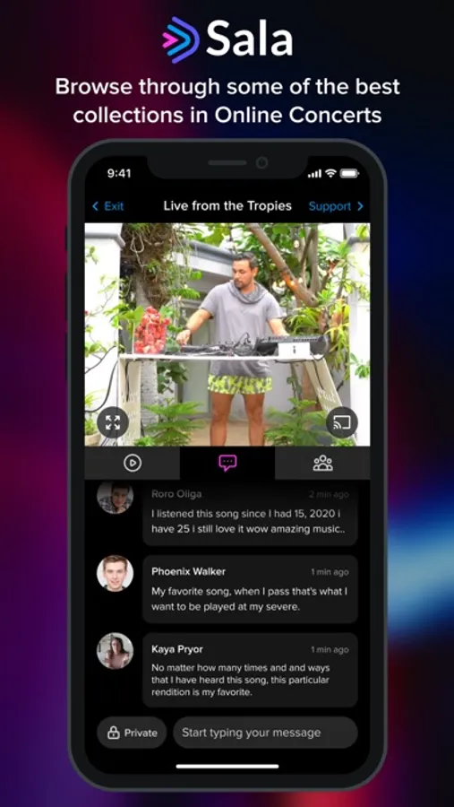 Artists create live streamed events, monetise performances, sell merchandise, and connect with fans. SALA provides a seamless process of creating and managing concerts through an extremely user friendly interface that excites the user to join in the community and get entertained as well.