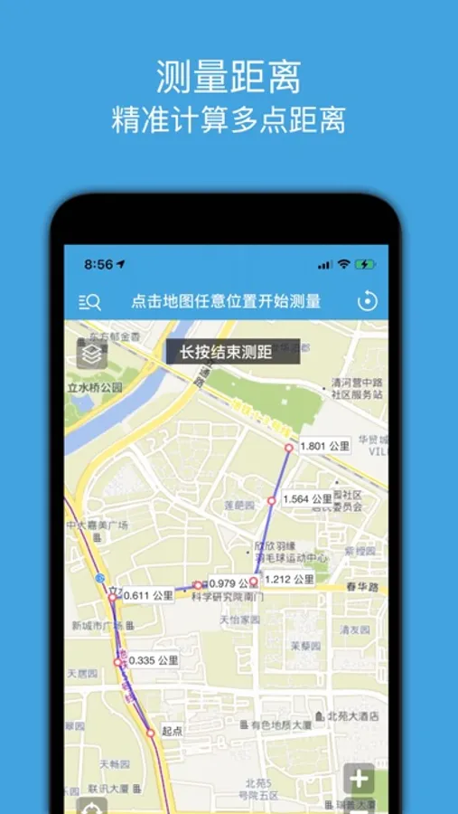 2.在地图上自定义任意多点折线测量距离。