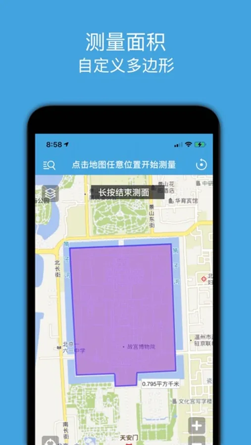 这是一款专业测量地图的软件,您可以在地图上自定义绘制任意多边形测量面积,也可以自定义任意多点折线测量距离,是一款非常实用的地图测绘工具。