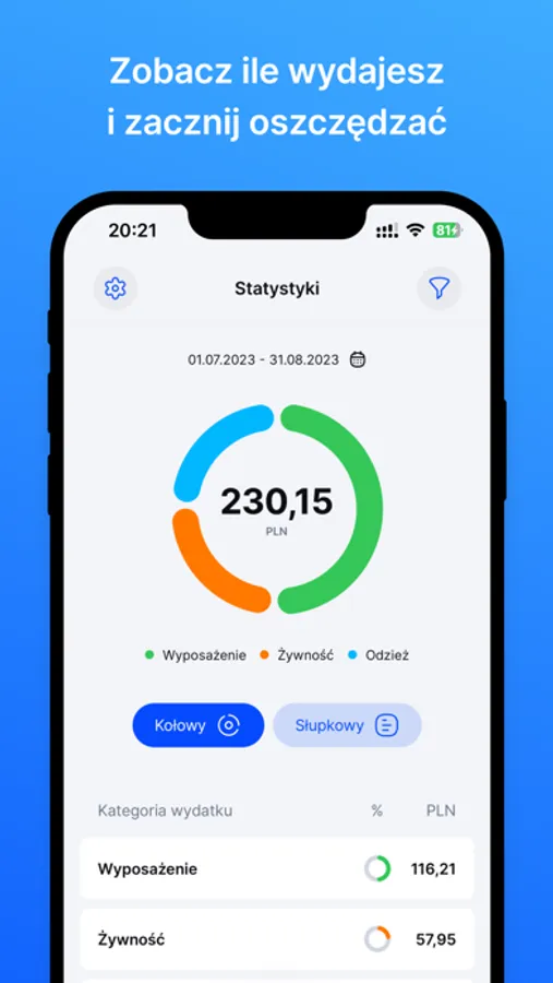 Odkryj nowy poziom zarządzania finansami! Analizuj wydatki i obserwuj, jak rosną Twoje oszczędności! Dzięki przejrzystym statystykom i analizom, zyskasz pełen wgląd w swoje finanse!