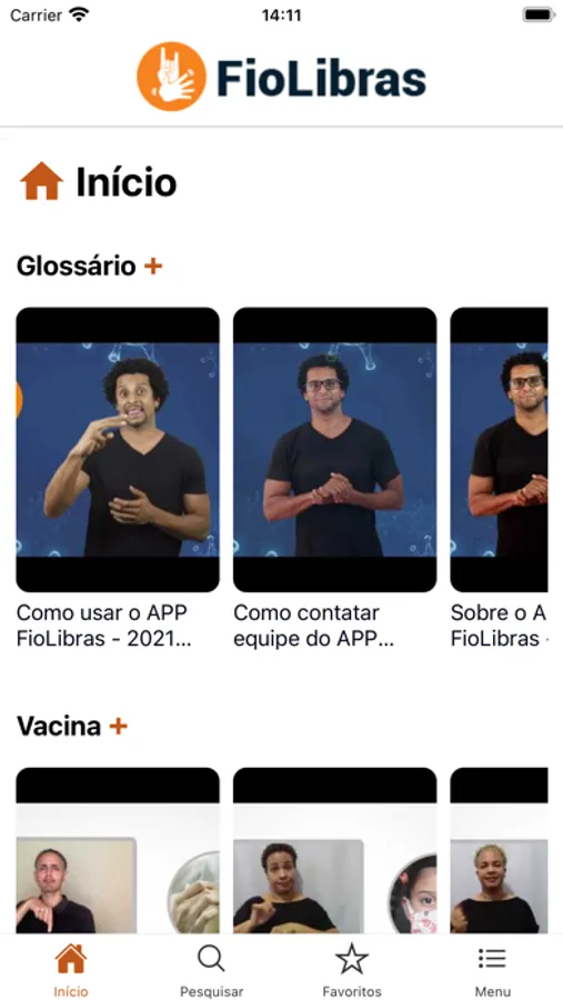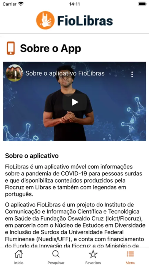 FioLibras é um app para pessoas surdas e profissionais de saúde, produzido pela Fiocruz, com informações confiáveis e atualizadas sobre o novo coronavírus e a pandemia da COVID-19, disponíveis na Língua Brasileira de Sinais (Libras), com legendas e narração em português. O aplicativo é gratuito e não é necessário fazer nenhum cadastro para acessar. Para acessar os vídeos em Libras sobre a COVID-19, basta fazer uma busca por palavras em português ou navegar pelas categorias e saber mais sobre: O que é COVID-19, Fake News (Notícias falsas), Prevenção, Sintomas, Transmissão, Diagnóstico, Tratamento, Vacina, Grupos de risco, Notícias, Pesquisas científicas e Bem-Estar na Pandemia. Clique em um vídeo para selecionar e assistir em tela cheia. Para marcar um vídeo como “Favorito”, clique no ícone de estrela. Se você gostar desse aplicativo, conte para seus amigos e amigas e ajude-nos a levar essas informações para outras pessoas surdas. Caso tenha alguma dúvida ou sugestão, entre em contato conosco, enviando uma mensagem ou um vídeo em Libras pelo app.