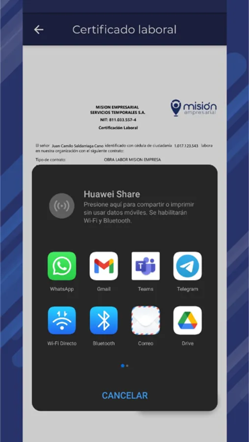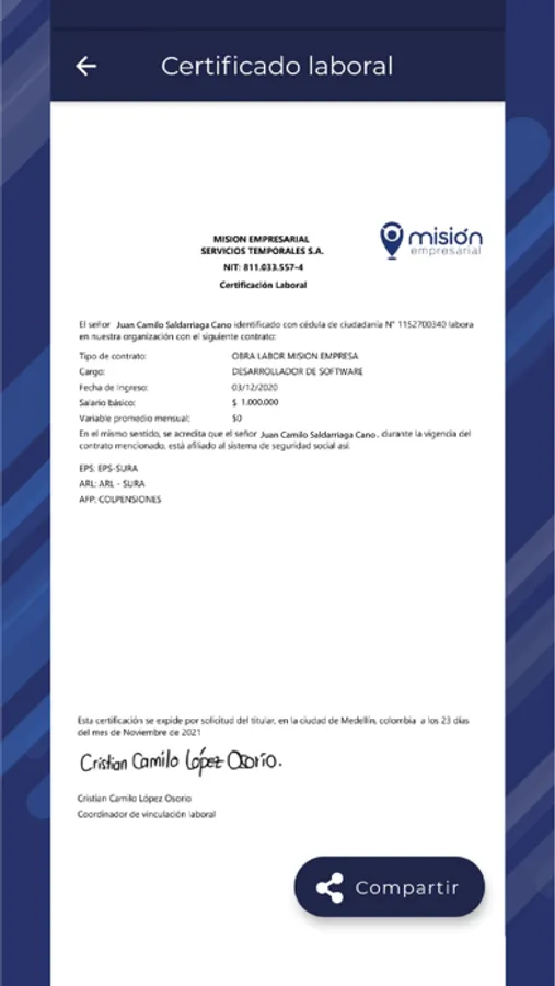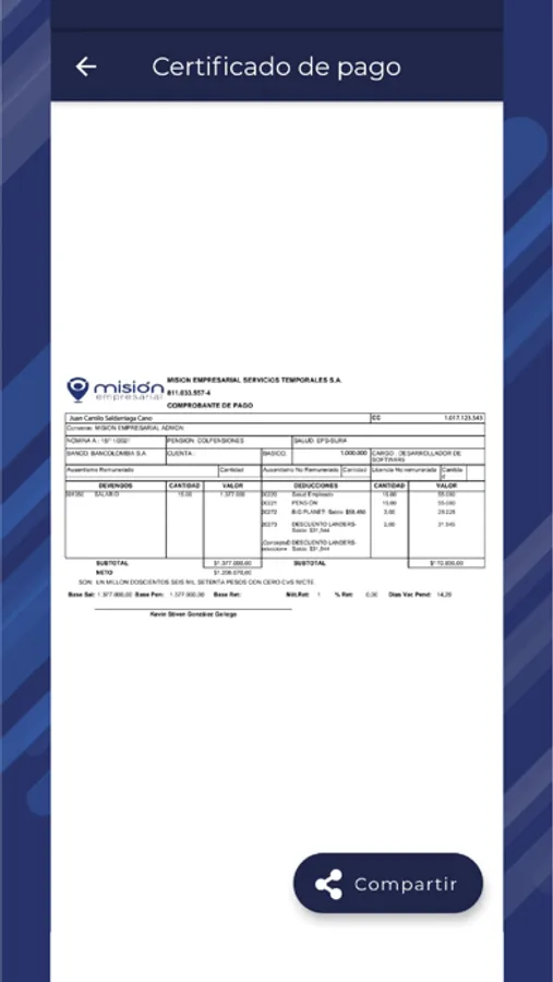 * Generar y compartir certificado de pago (Liquidación de nómina, prima de servicios, liquidación de contrato, anticipo cesantías, intereses de cesantías).