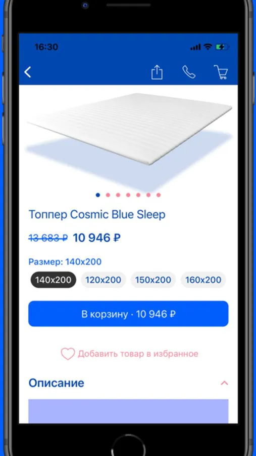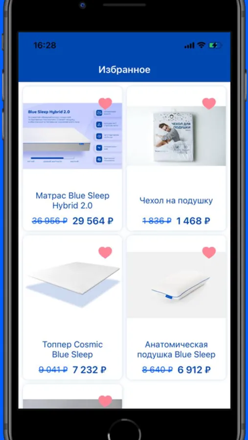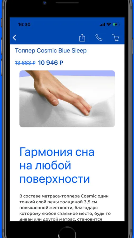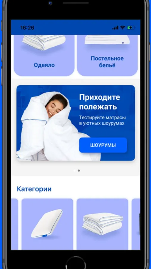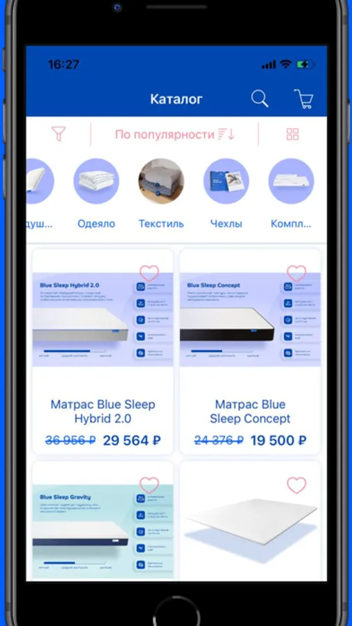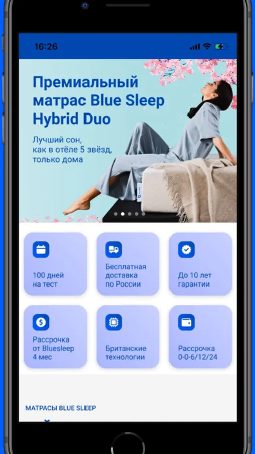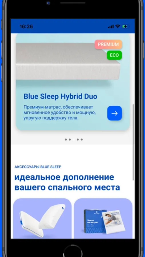 Мобильное приложение Blue Sleep с товарами для сна дает возможность узнать больше об ассортименте, получать скидки и быть в курсе акций и специальных предложений.