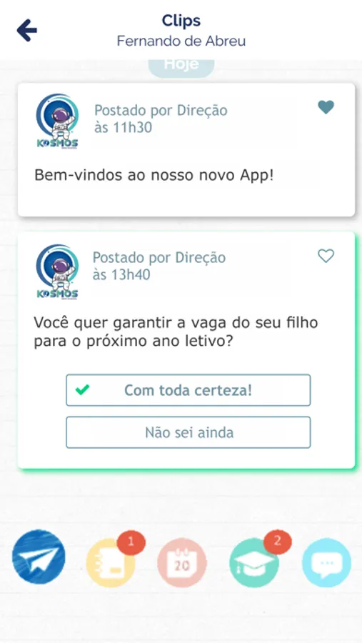 Comunicação acolhedora e interação de excelência entre família, escola e colaboradores do Kosmos Centro Educacional. Forma Simplificada, Ágil e Estruturada. Nesse aplicativo você receberá e poderá enviar comunicados, avisos e atividades do cotidiano de nossa rotina escolar.