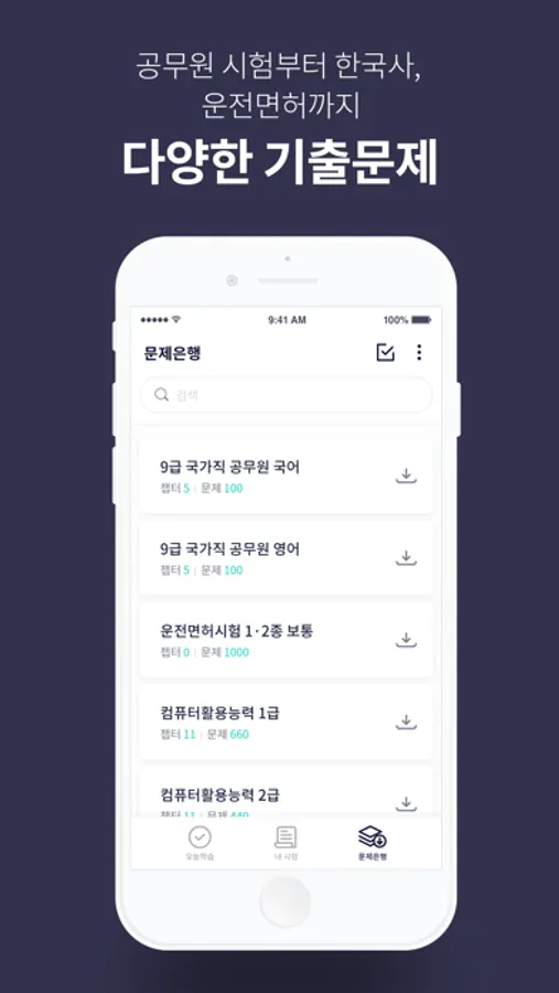- 9급 공무원(국가직, 지방직, 지역인재) / 7급 공무원(국가직, 민경채)/ 공인중개사 / 산업안전(기사, 산업기사, 지도사)/ 전기(기사, 산업기사, 기능사) / 지게차운전기능사 / 컴퓨터활용능력(1급, 2급) / 워드프로세서 / 제과기능사/ 제빵기능사 / 사회복지사 / 요양보호사 / 한국사능력검정시험(기본, 심화) / 토익 영단어(기초, 고급) /HSK 필수단어(1급, 2급, 3급, 4급, 5급, 6급) / 약 300개의 국가직 자격증