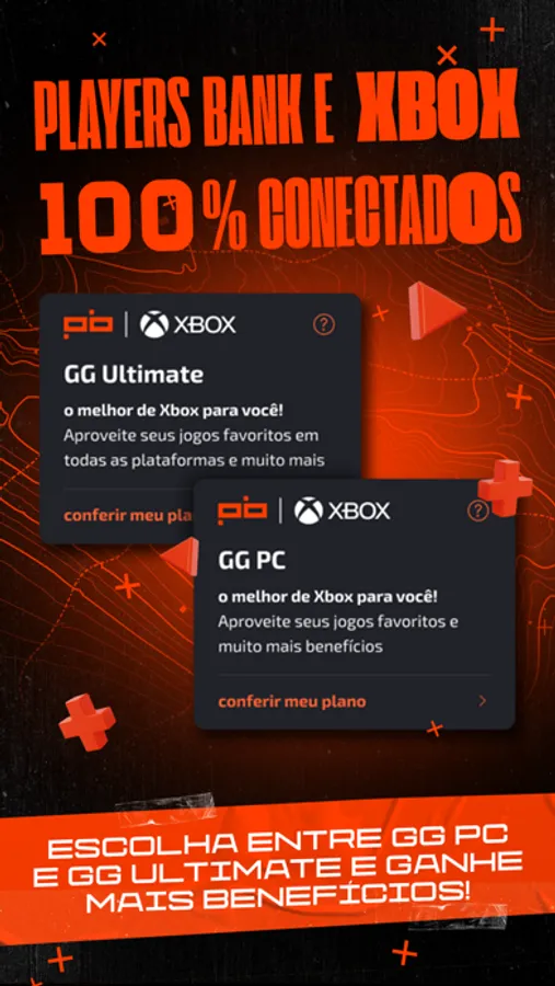 Ao abrir conta no PB você pode assinar o GG Ultimate ou GG PC pelo app e ganhar 10% de cashback ao usar o cartão de crédito Player’s Bank na XBOX Network.
