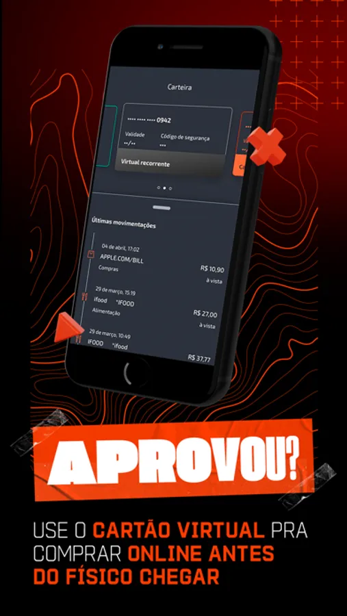 Aprovou? Nem precisa esperar o cartão físico chegar! Você já pode gerar o cartão virtual pra pagar aquela assinatura recorrente ou temporário pra comprar moedas do seu jogo favorito.