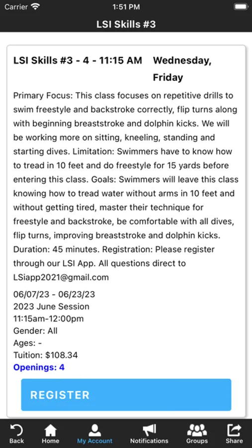 The Lifestyle Swimming Instruction app allows you to manage your account with ease, register for classes, parties, and special events. You'll also receive important notifications about class changes, closings, registration openings, special announcements, and upcoming events.