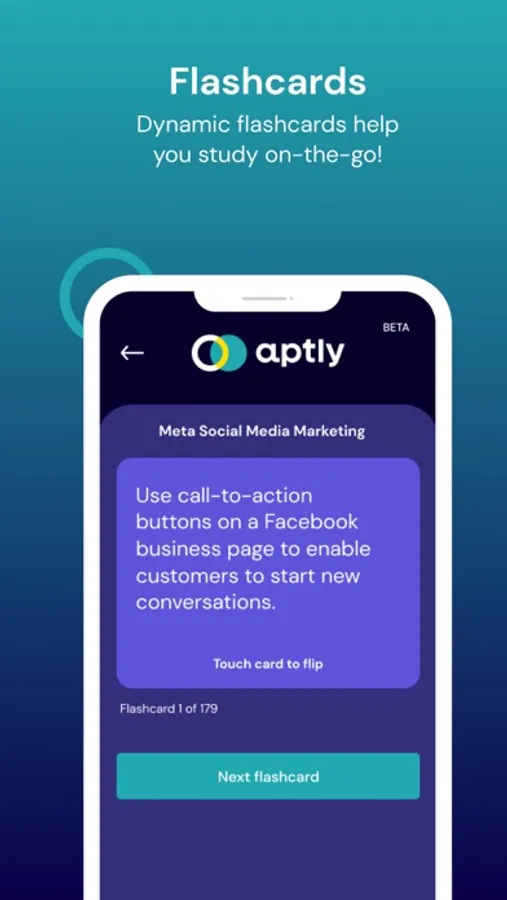 The Aptly mobile app allows you to jump in and practice for your certification exam with quiz-like questions and flashcards to deepen your understanding of key terms. The hands-on practice and detailed feedback are perfect support for your exam preparation efforts. The app also tracks your performance so you can easily focus your attention where you need it most.