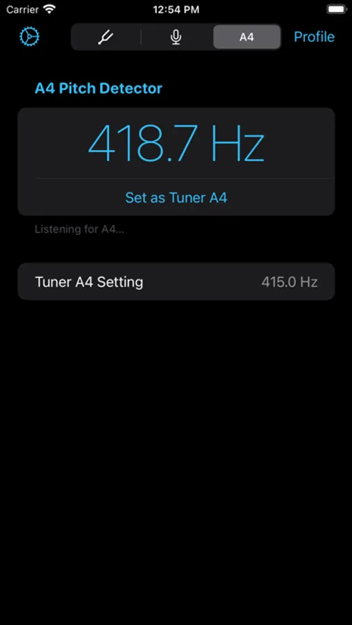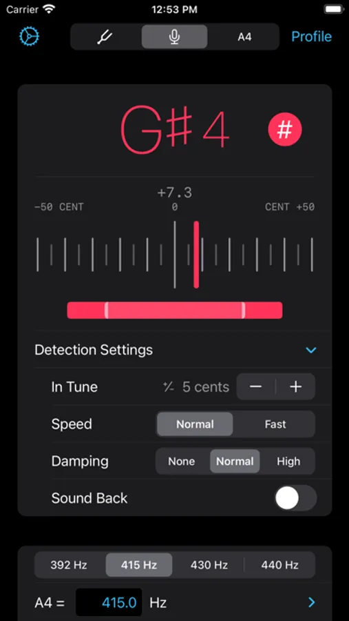 - Quick selection of common pitch levels: 392, 415, 430, and 440 Hz (these are customizable).