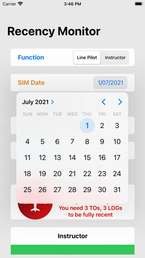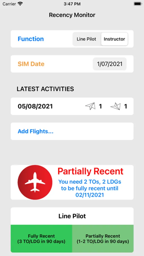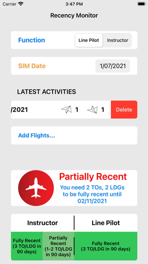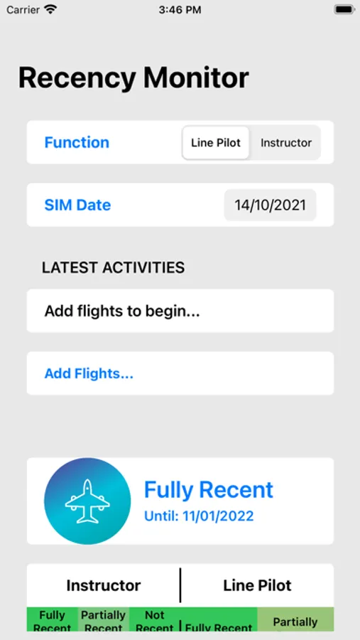 Insert the SIM Date and the flights to be monitored for recency. Including function of Targeted Exemption.