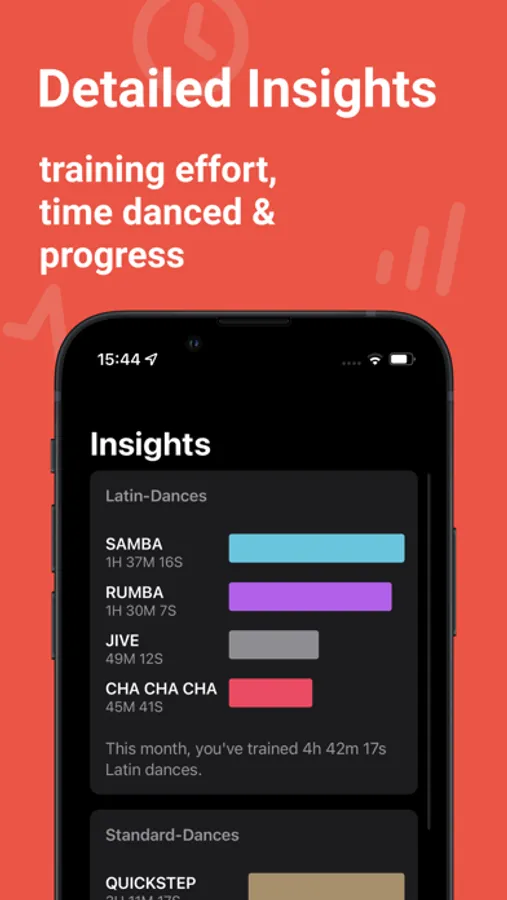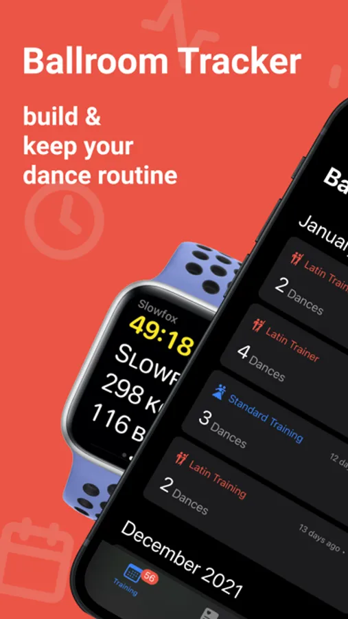 Track your dances during ballroom training including latin dances like Cha-Cha-Cha, Rumba, Jive, Samba, Paso Doble and standard dances like Waltz, Quickstep, Tango, Slow Foxtrot and Vienesse Waltz. Start and save workouts from your Apple Watch. Visualize your progress and training data right in Ballroom Tracker.