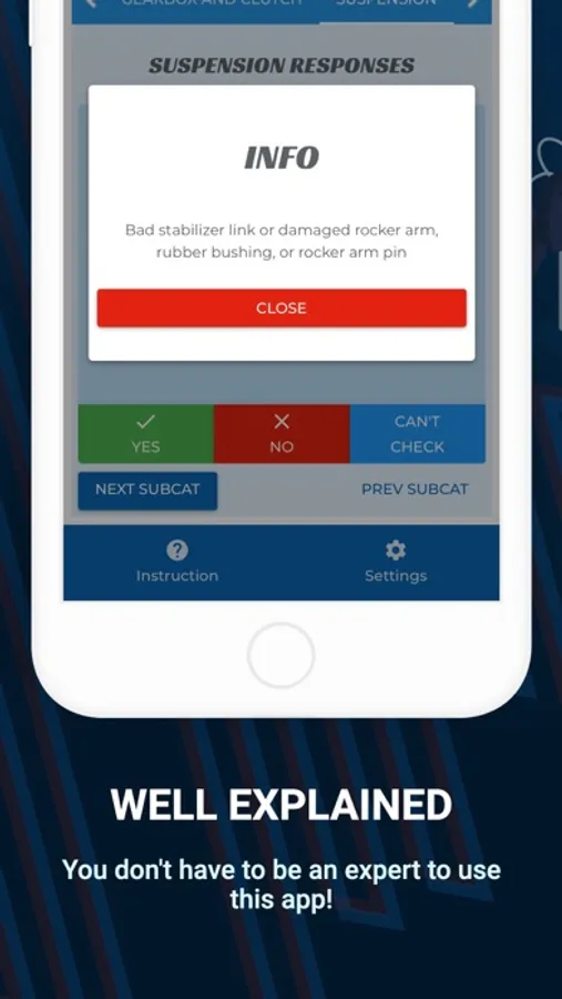 Most of the questions have an 'i' button and a short description of the fault will appear.