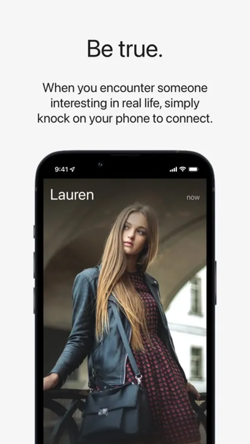 Be true. You notice someone and lock eyes. The opportunity to meet is fragile and fleeting. Sometimes fate deserves a second chance. Simply knock on your phone three times to indicate you’re interested in someone, or receive potential matches when others knock for you. Never settle.