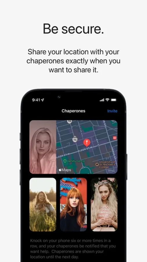 Be secure. Safety is important to you, so you use the complementary chaperone service with your friends. Simply knock on your phone six or more times to notify your chaperones with your location. Never settle.