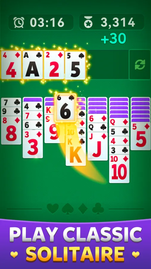 Sort a 52-card deck by tapping to move cards from the stock to the 7-column tableau with the ultimate goal of arranging all 4 suits into ascending order. Race against the clock to earn the highest score you can and outperform opponents to claim match prizes. Anyone can play this simple solitaire game, but it takes skill to walk away a champion!