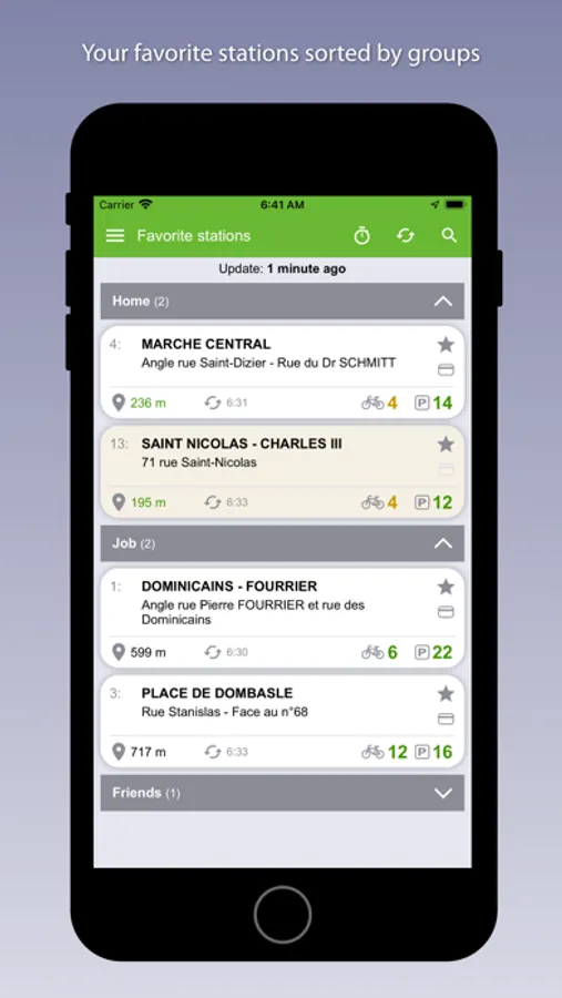 - List of favorite stations categorized by groups (home, work, friends or general).