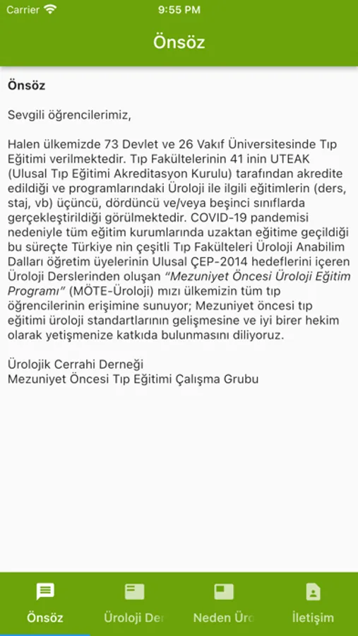 Halen ülkemizde 73 Devlet ve 26 Vakıf Üniversitesinde Tıp Eğitimi verilmektedir. Tıp Fakültelerinin 41 inin UTEAK (Ulusal Tıp Eğitimi Akreditasyon Kurulu) tarafından akredite edildiği ve programlarındaki Üroloji ile ilgili eğitimlerin (ders, staj, vb) üçüncü, dördüncü ve/veya beşinci sınıflarda gerçekleştirildiği görülmektedir. Tüm dünyada eğitim kurumlarında uzaktan eğitime geçildiği bu süreçte Türkiye nin çeşitli Tıp Fakülteleri Üroloji Anabilim Dalları öğretim üyelerinin Ulusal ÇEP-2014 hedeflerini içeren Üroloji Derslerinden oluşan “Mezuniyet Öncesi Üroloji Eğitim Programı” (MÖTE-Üroloji) mızı ülkemizin tüm tıp öğrencilerinin erişimine sunuyor; Mezuniyet öncesi tıp eğitimi üroloji standartlarının gelişmesine ve iyi birer hekim olarak yetişmenize katkıda bulunmasını diliyoruz.
