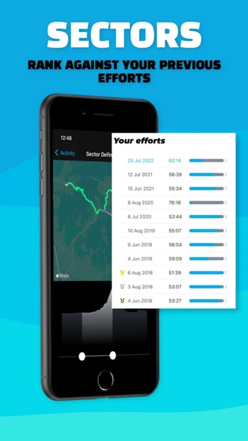 Be better than you were yesterday. Define sectors before you start a new ride, and compete on-the-fly against your best effort from previous rides.