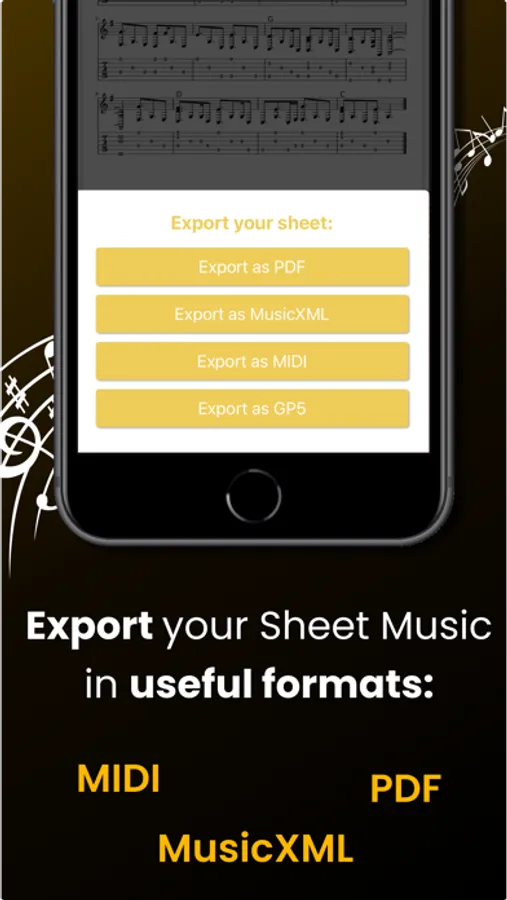 When the processing is finished, you can view the final sheet and export it in different outputs - a Midi file, a PDF engraved sheet, a Guitar Pro 5 file and a MusicXML digital note sheet.